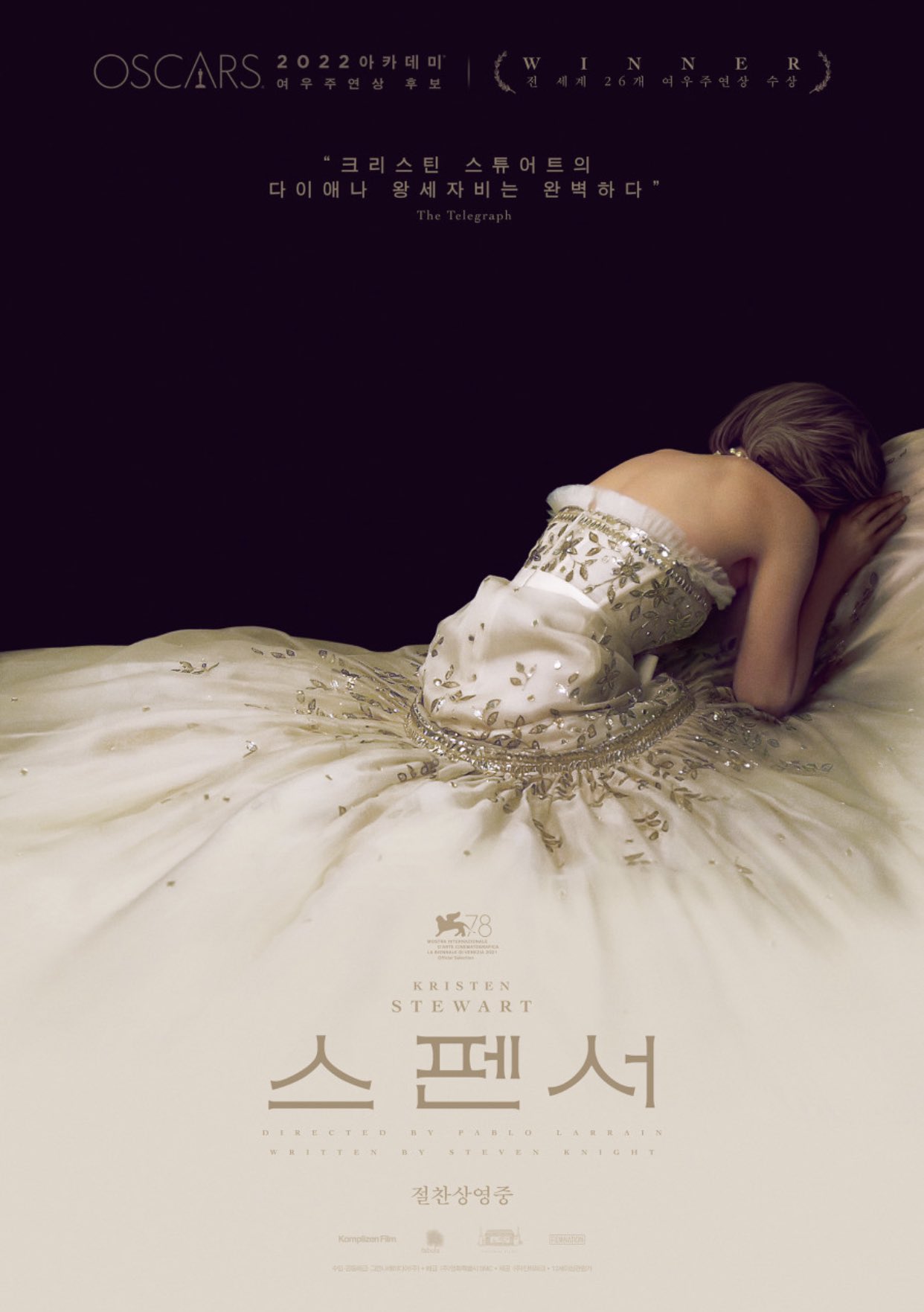 찰스 왕세자가 불륜을 인정했을 때 다이애나가 입고 나온 복수의 검은 드레스. 영국 왕실의 모든 의상규정을 위반한다는 그 드레스. 그 드레스를 입고 찍혔던 다이애나비의 표정이 정말 해방감을 만끽하는 표정이라 좋아했는데, 영화에서 다이애나가 '비'가 아닌 '스펜서'로 살아가길 결정하면서 영화가 시작할 때 찾은 코트를 입었을 때. 우울하고 생기 없고 신경증적으로 묘사되던 다이애나 스펜서는 1시간 40분 동안 가장 밝고 생기넘치는 표정을 짓는다.