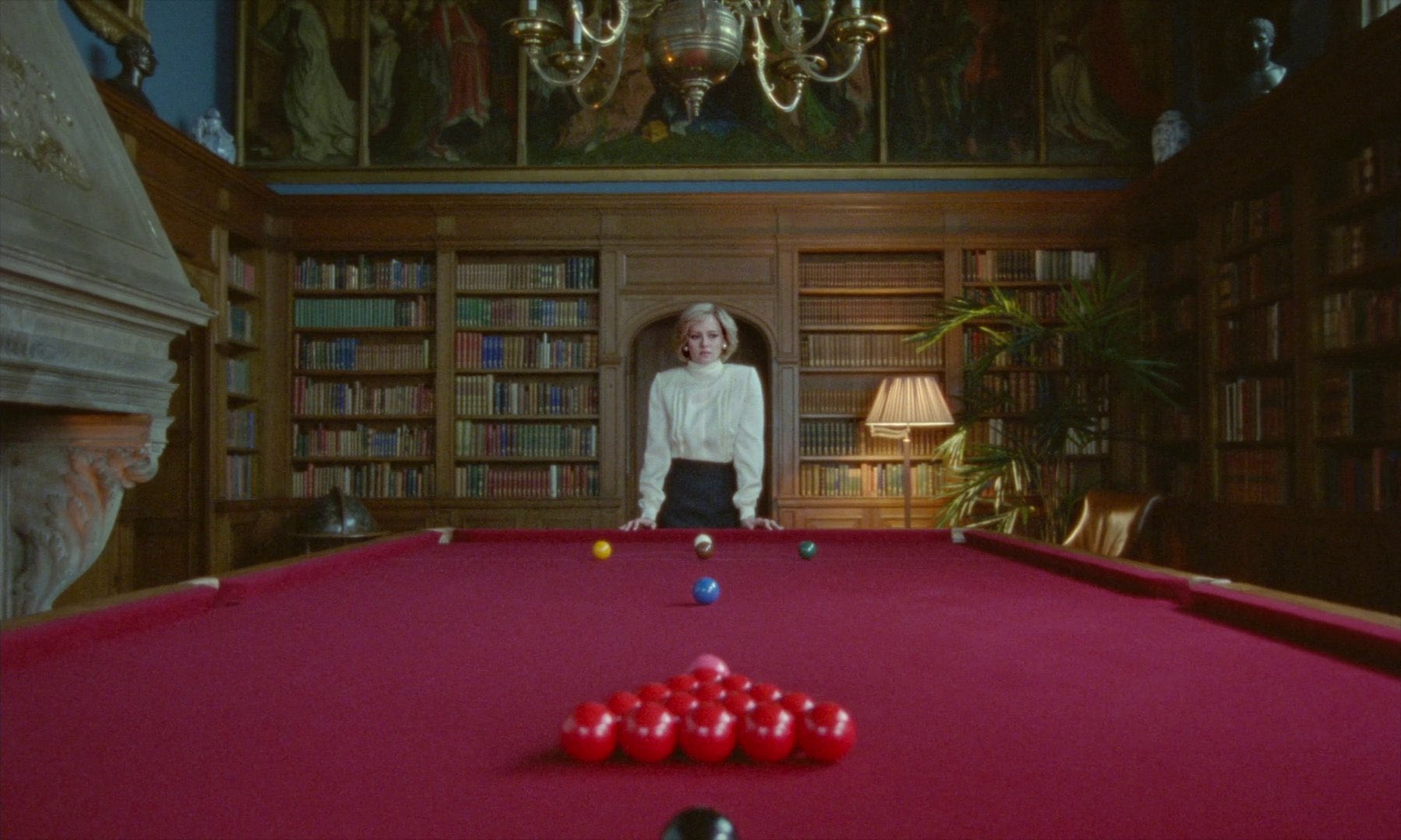 당구 테이블 한가운데에 작게 놓인 다이애나의 모습과 다이애나를 향한 화살표 모양으로 정렬된 당구공들 모든 대중의 시선과 왕실의 억압처럼 공들이 다이애나를 향해 있는데 다이애나는 취약하고 의지할 곳 없게 그려지는 이 장면.